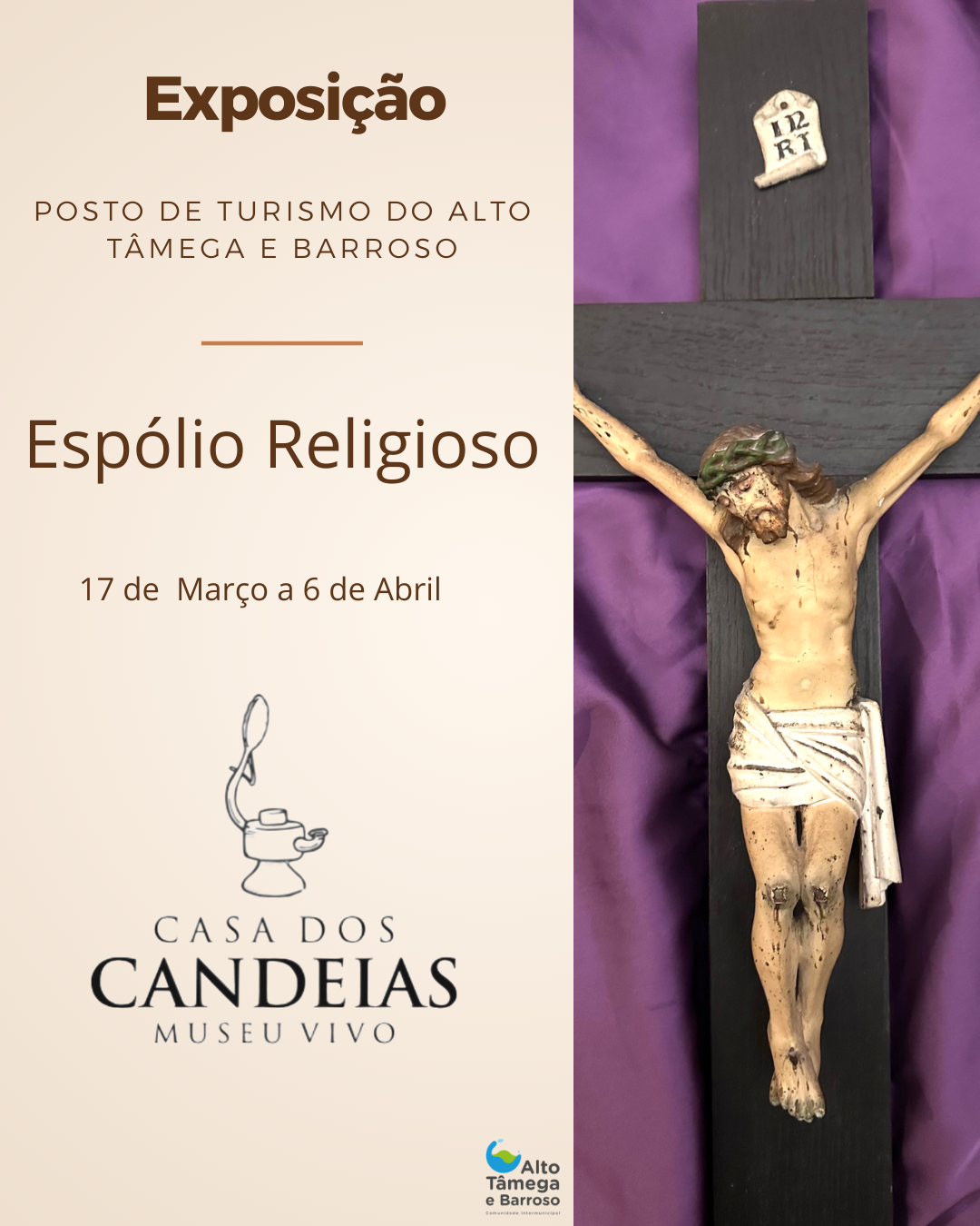 O Posto de Turismo do Alto Tâmega e Barroso (PTAT) recebe, entre os dias 17 de março e 6 de abril, a exposição “Espólio Religioso”, uma mostra evocativa da época da Páscoa que resulta de uma parceria com a Casa dos Candeias – Museu Vivo.