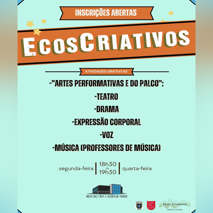 The 𝐄𝐜𝐨𝐬𝐂𝐫𝐢𝐚𝐭𝐢𝐯𝐨𝐬 project, created with the main objective of promoting artistic expression and offering new experiences to the community, is currently with 𝐢𝐧𝐬𝐜𝐫𝐢𝐜̧𝐨̃𝐞𝐬 𝐚𝐛𝐞𝐫𝐭𝐚𝐬.