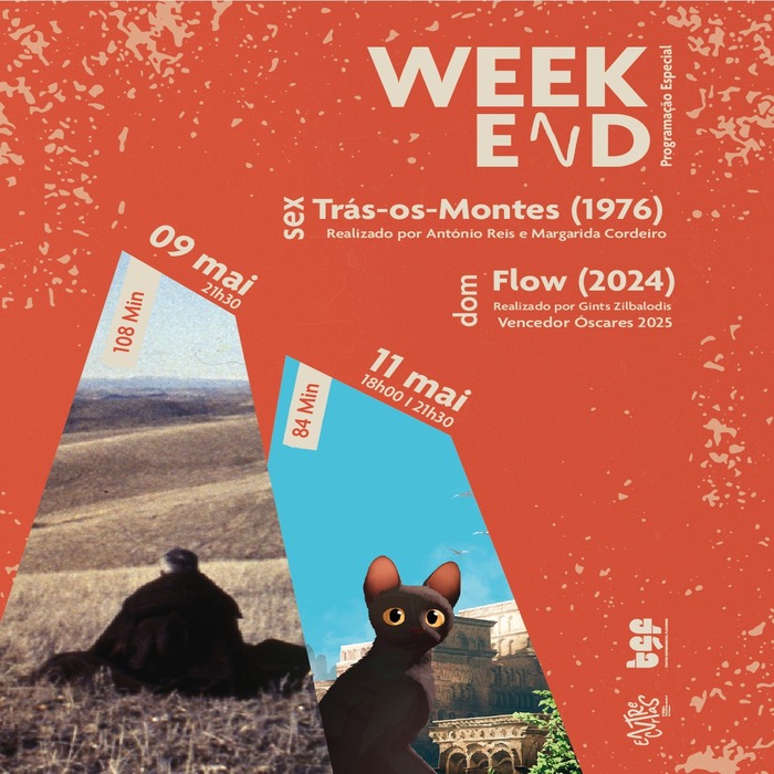 No domingo, às 18h00 e às 21h30, teremos em exibição o filme de animação Flow, vencedor do Óscar de Melhor Filme de Animação e Melhor Filme Internacional.