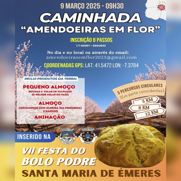 A caminhada “𝑨𝒎𝒆𝒏𝒅𝒐𝒆𝒊𝒓𝒂𝒔 𝒆𝒎 𝑭𝒍𝒐𝒓”, inserida na 𝑽𝑰𝑰 𝑭𝒆𝒔𝒕𝒂 𝒅𝒐 𝑩𝒐𝒍𝒐 𝑷𝒐𝒅𝒓𝒆 – 𝑷𝒓𝒐𝒅𝒖𝒕𝒐𝒔 𝒆 𝑺𝒂𝒃𝒐𝒓𝒆𝒔, de Santa Maria de Émeres, irá decorrer no próximo dia 9 de Março, às 9h30, e contará com 3 percursos circulares.
